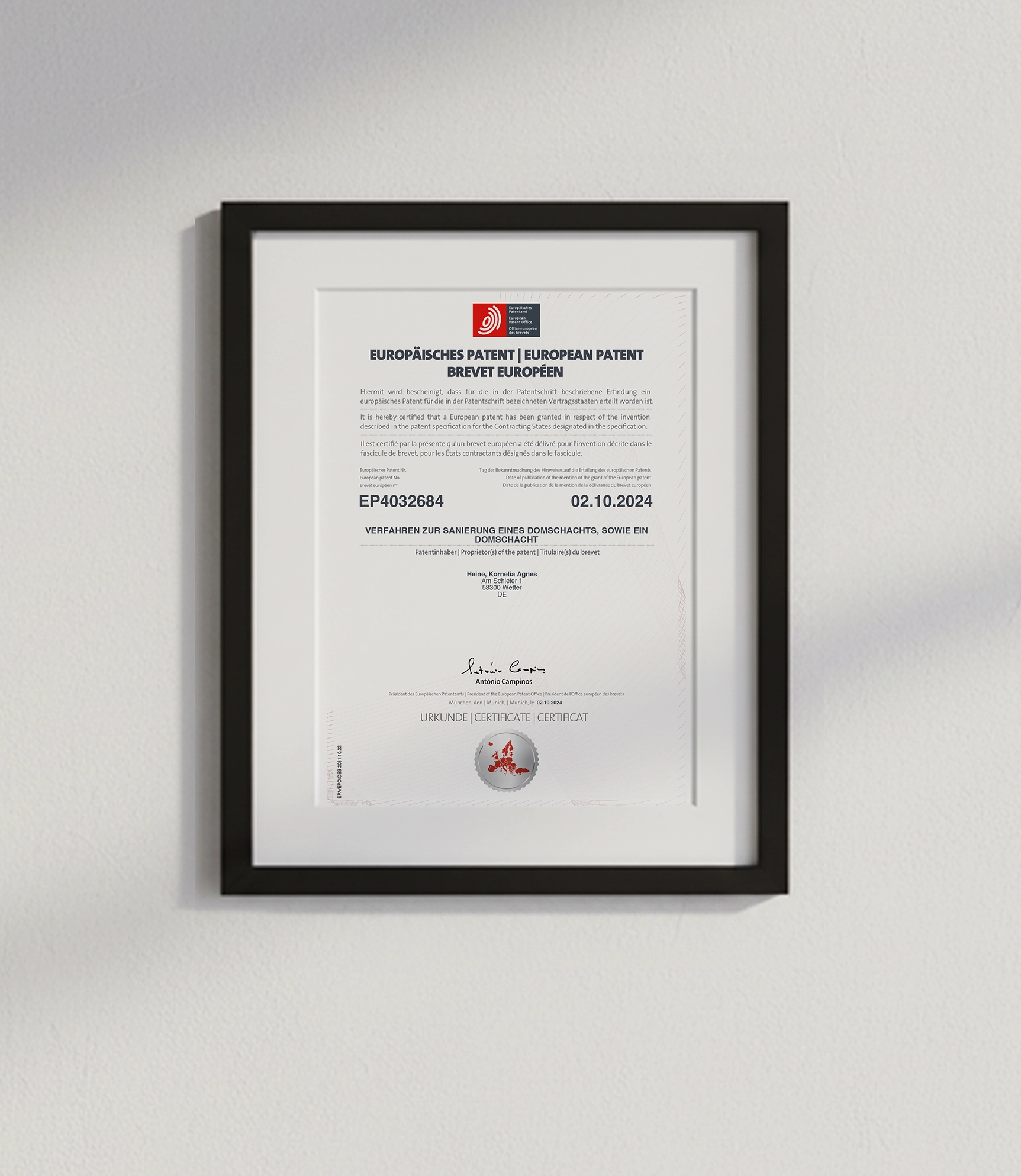 Unser Sanierungsverfahren für Domschächte wurde nicht nur mit dem europäischen Patent EP4032684 ausgezeichnet, sondern ist auch als Einheitspatent in zahlreichen EU-Ländern registriert. Das unterstreicht unsere technologische Führungsrolle und unseren Qualitätsanspruch auf europäischer Ebene.