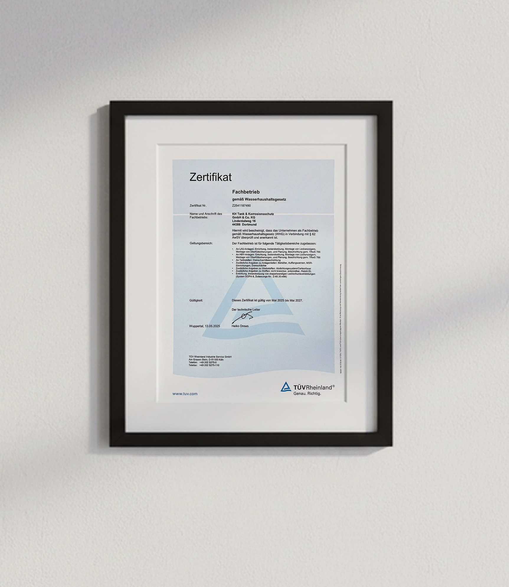 Die Zertifizierung bestätigt unsere Kompetenz und Zuverlässigkeit im Umgang mit wassergefährdenden Stoffen und ist gültig bis zum 31. Januar 2028.