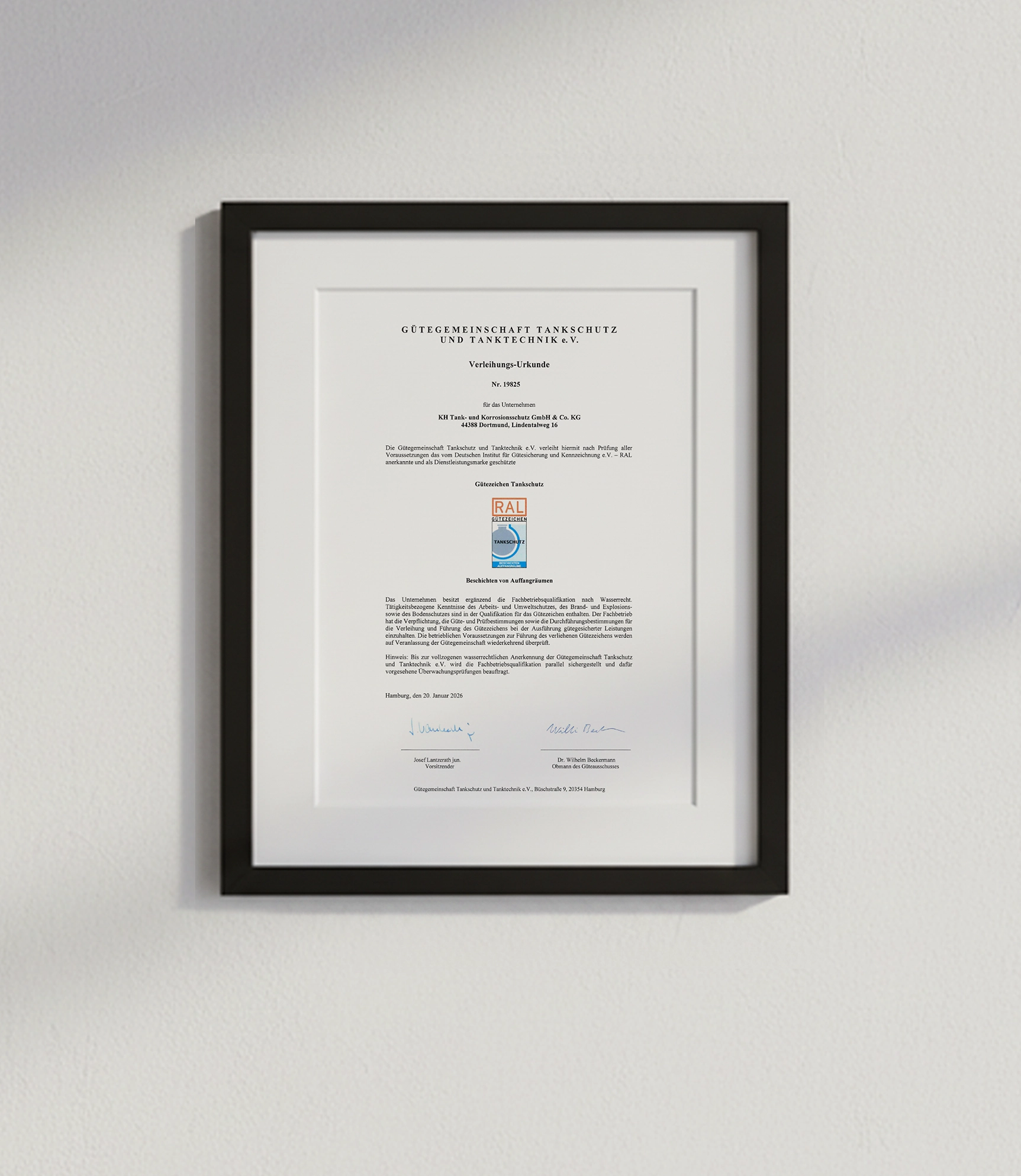 Das RAL-Gütezeichen für Tankinnenbeschichtung steht für geprüfte Qualität, Sicherheit und Langlebigkeit. Es bestätigt, dass Tankinnenbeschichtungen fachgerecht nach anerkannten Regeln der Technik ausgeführt werden und einen zuverlässigen Schutz vor Korrosion sowie vor dem Austritt wassergefährdender Stoffe bieten.